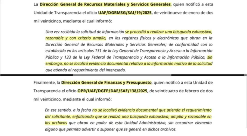 “Se procedió a realizar una búsqueda exhaustiva, razonable y con criterio amplio, sin embargo, no se localizó evidencia documental relativa a la información motivo de la solicitud”, se lee en el oficio UAF/DGRMSG/SAI/19/2025.