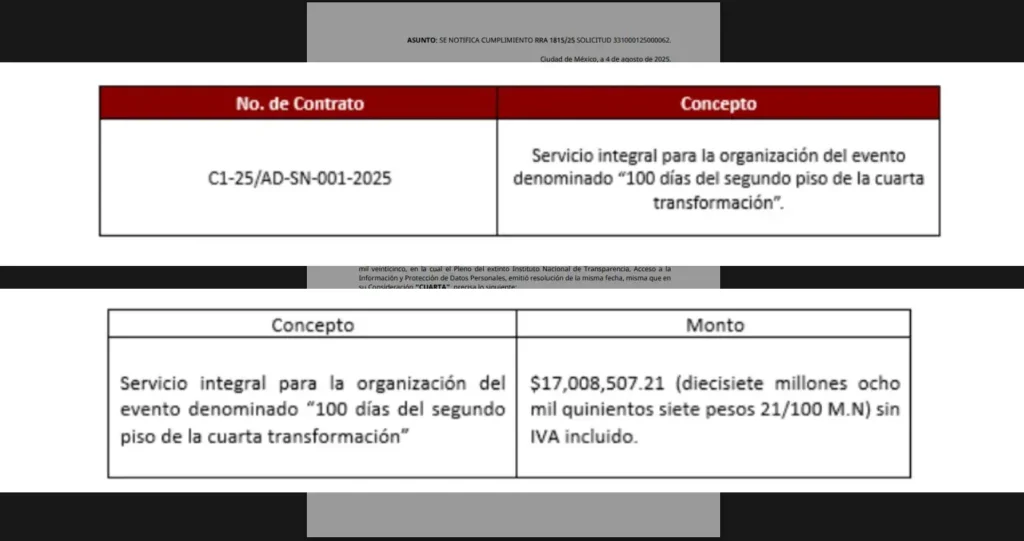 Ahora, la Dirección General de Recursos Materiales y Servicios Generales de Presidencia respondió que efectivamente se había firmado un contrato con el número C1-25/AD-SN-001-2025 bajo el concepto “Servicio integral para la organización del evento denominado 100 días del Segundo Piso de la Cuarta Transformación”.