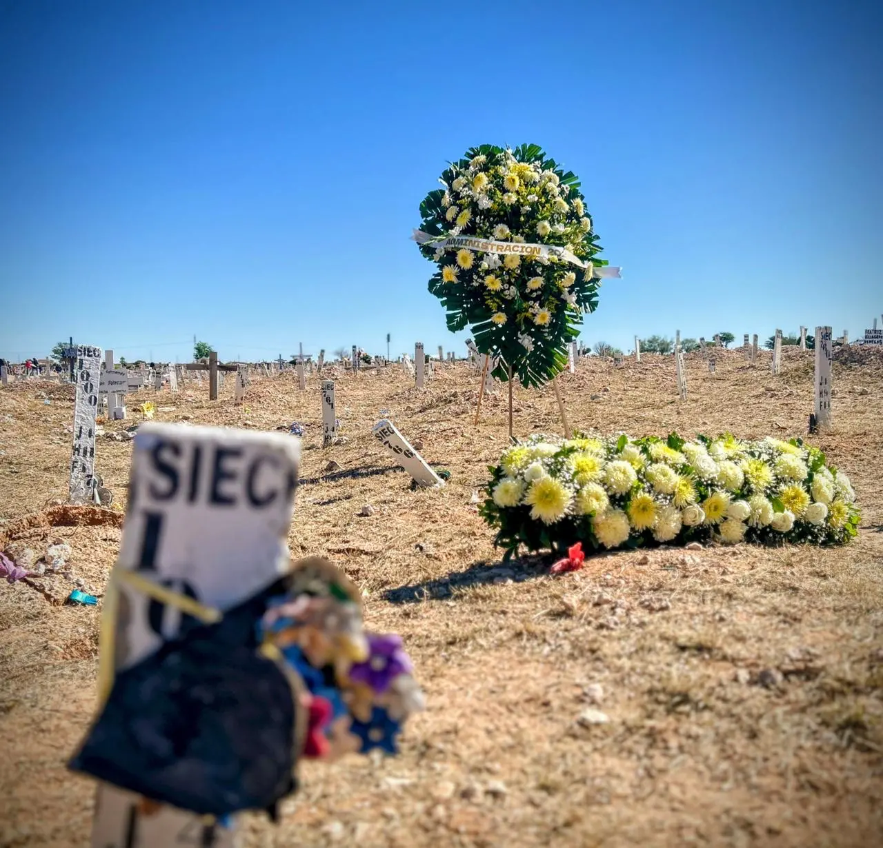 Aunque la zona de la fosa común no está aislada, son pocos los que se acercan, tan sólo cuando hay que remover la tierra para ingresar más cuerpos. A este lugar, el presidente municipal, Cruz Pérez Cuéllar, entregó un arreglo floral este domingo, en memoria de quienes no tienen nombre.
