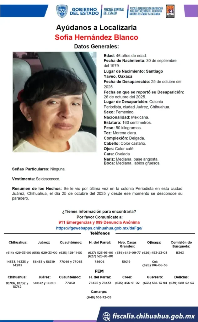 El 6 de Noviembre, la Fiscalía Especializada en Atención a Mujeres informó que realizó un operativo de búsqueda en la carretera Juárez–Ascensión, como parte de las acciones para localizar a Sofía Hernández Blanco.