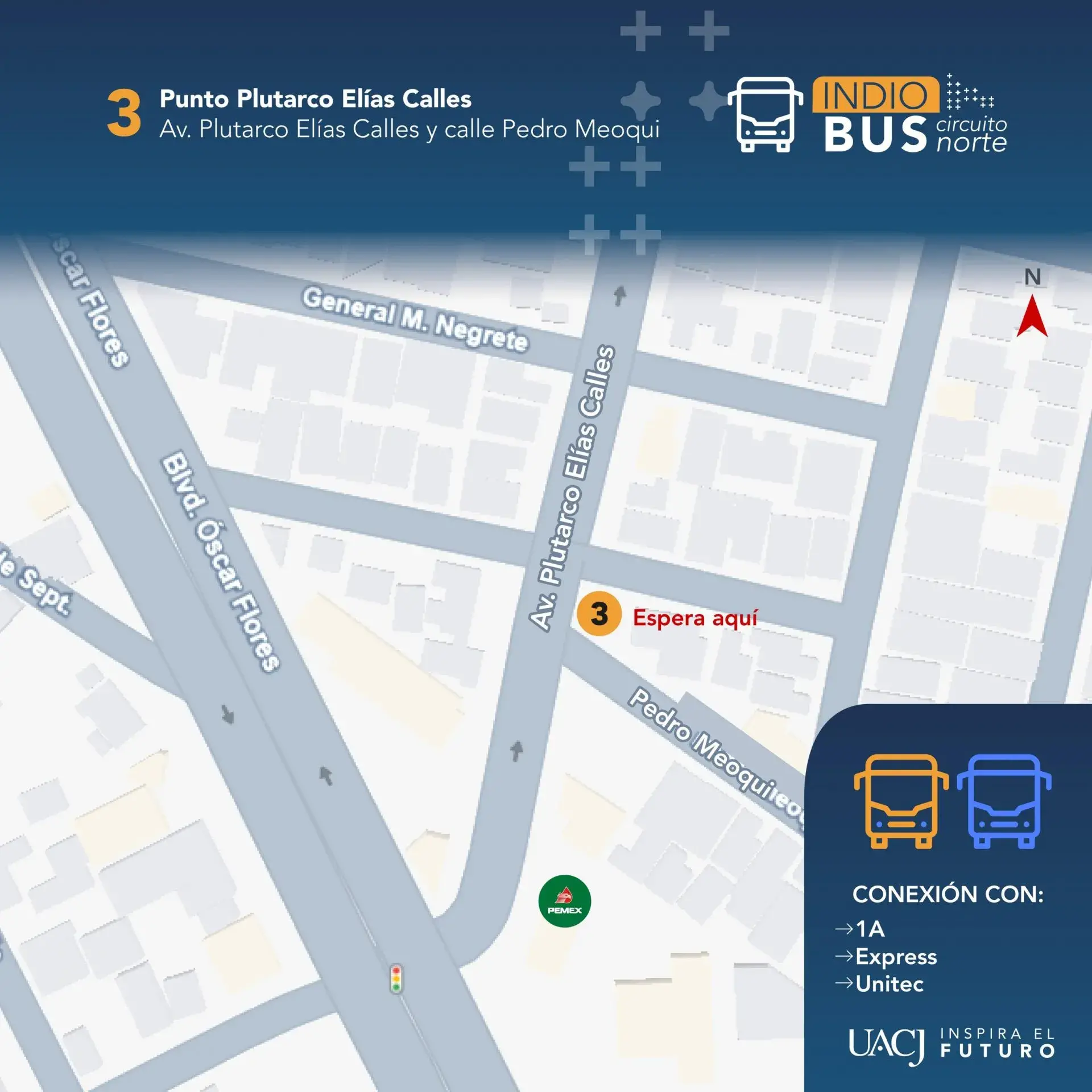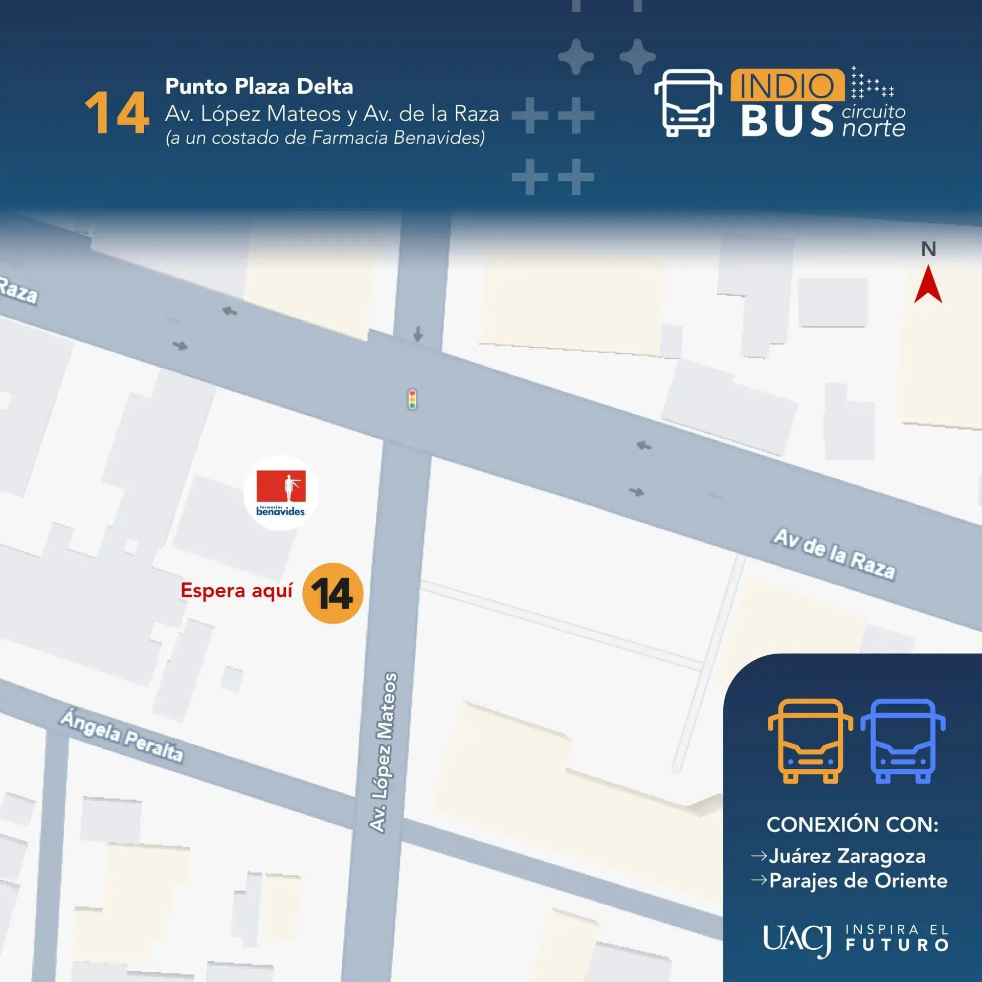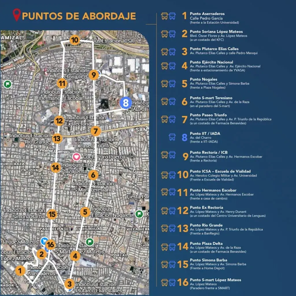 El circuito transitará por Plutarco Elías Calles, López Mateos, Eje Vial Juan Gabriel, bulevar Óscar Flores, Ejército Nacional, Simona Barba, Avenida de la Raza, Paseo Triunfo de la República y Hermanos Escobar, con paraderos definidos.