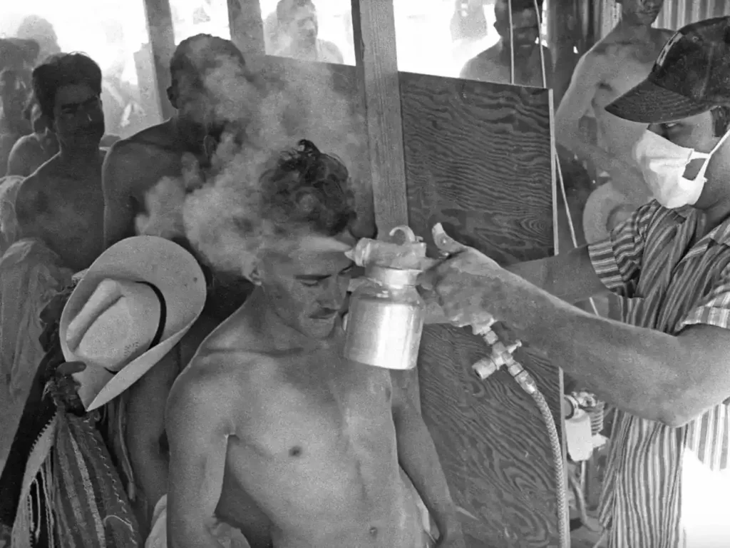 La frontera sur ofrece otro capítulo poco recordado. A inicios del siglo XX, miles de mexicanos que cruzaban hacia Estados Unidos eran sometidos a “baños de desinfección” con químicos agresivos bajo el argumento de prevenir enfermedades.