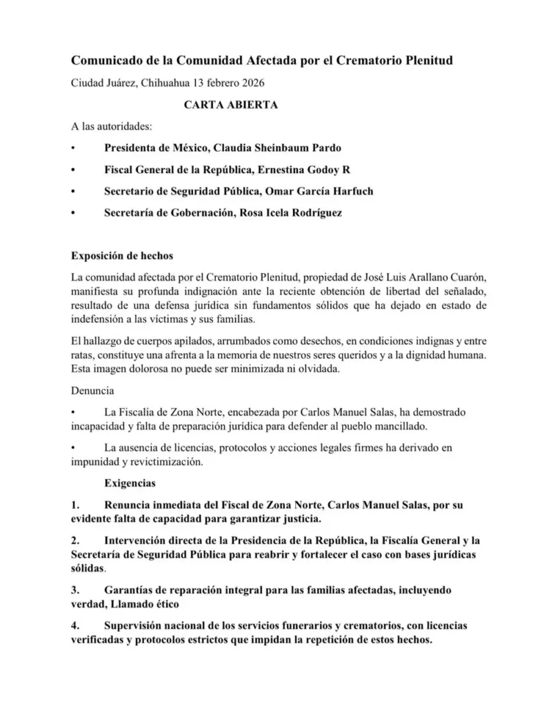 También solicitaron supervisión nacional de crematorios y licencias verificadas para evitar que hechos similares se repitan en Ciudad Juárez, donde el caso aún mantiene abiertas heridas sociales.