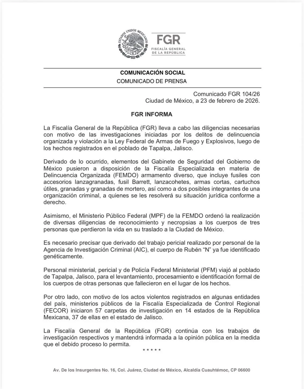 También precisa que el Ministerio Público Federal ordenó diligencias de reconocimiento y necropsias a los cuerpos de tres personas que fallecieron durante su traslado a la Ciudad de México, mientras personal ministerial y pericial se trasladó a Tapalpa para el levantamiento e identificación formal de otros cuerpos en el lugar.