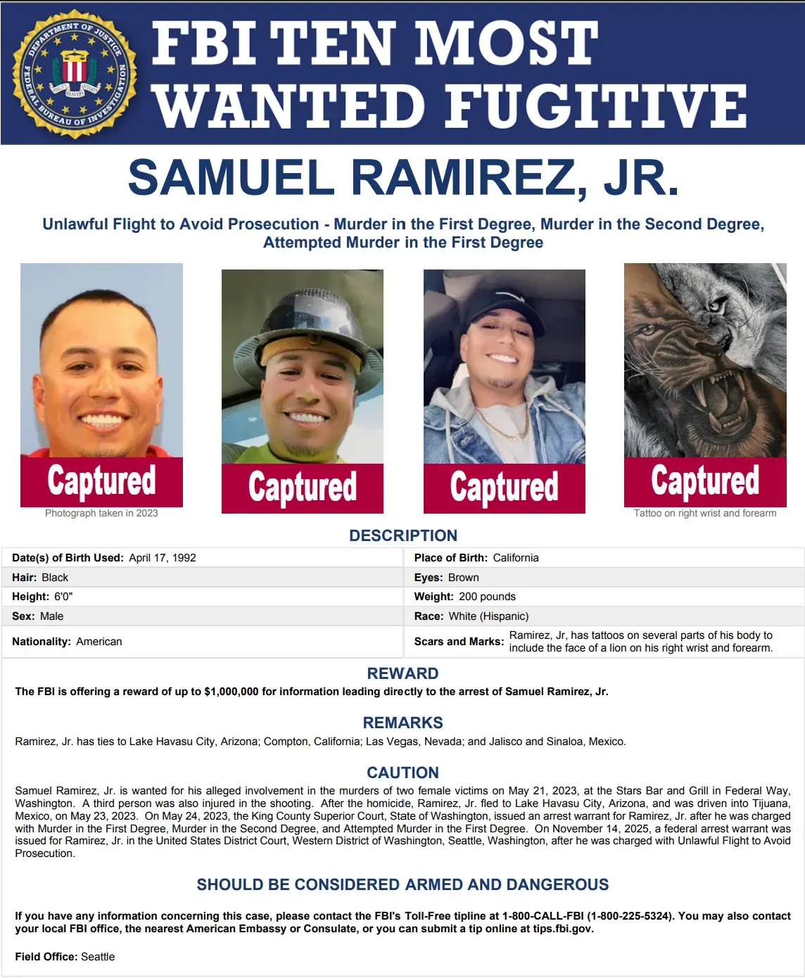 Ramírez Jr., de 33 años, era buscado por su presunta participación en el asesinato de dos mujeres en un atentado registrado en mayo del 2023, en un bar de Federal Way en Washington, donde una tercera persona resultó lesionada.