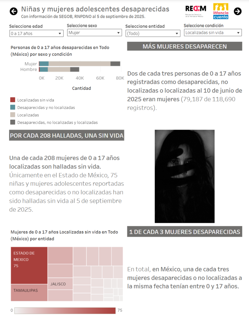 Sin embargo, el caso de Yolett no es aislado, pues en promedio, en el país se registran 29 reportes diarios de personas de entre cero y 17 años desaparecidas, donde una de cada 100 son localizadas sin vida, de acuerdo con datos recopilados por la Red por los Derechos de la Infancia en México (REDIM) hasta el 5 de septiembre de 2025.