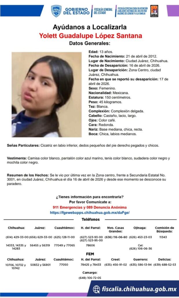 La señora Karla López Santana, madre de Yolett López Santana de 13 años, pide a las autoridades avances en la búsqueda de su hija, tras casi 5 días de haber desaparecido en #CiudadJuarez. Debido a ello, la tarde de este lunes protestaron afuera de donde fue vista por última vez. pic.twitter.com/YzXQRPCKoz