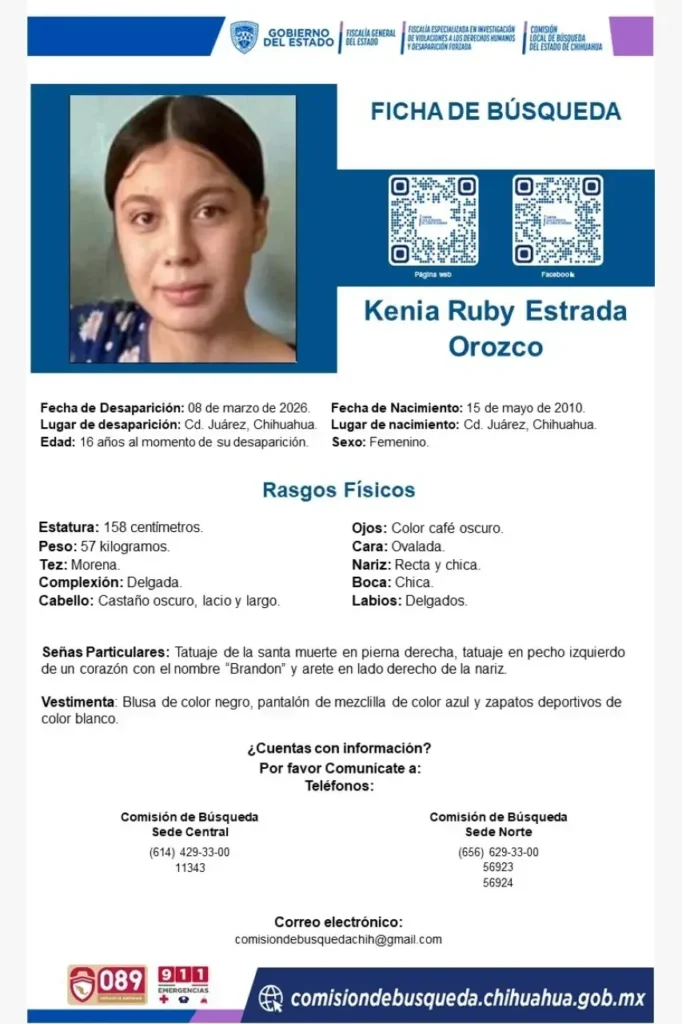 Mientras que el pasado 8 de marzo (irónicamente el Día de la Mujer), Kenia Rubí Estrada Orozco, de 16 años, fue vista por última vez. La joven mide 1.58 metros, es de tez morena y cabello castaño oscuro lacio.