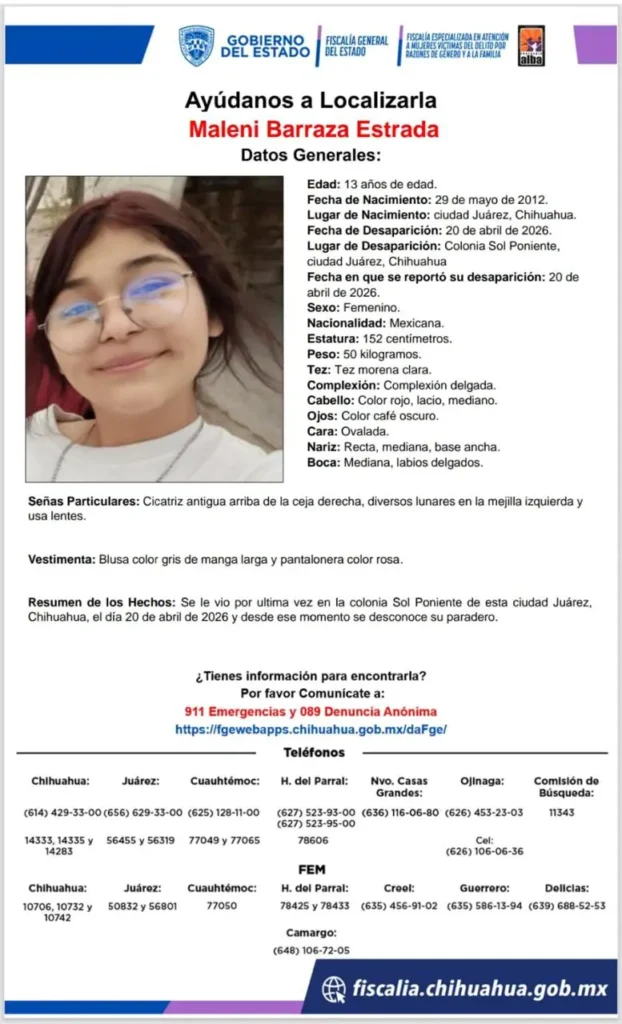 De acuerdo con la pesquisa oficial, Maleni fue vista por última vez este lunes 20 de abril en la colonia Sol Poniente, mide 1.52 metros, es de complexión delgada, tez morena clara y cabello rojo lacio, además usa lentes.