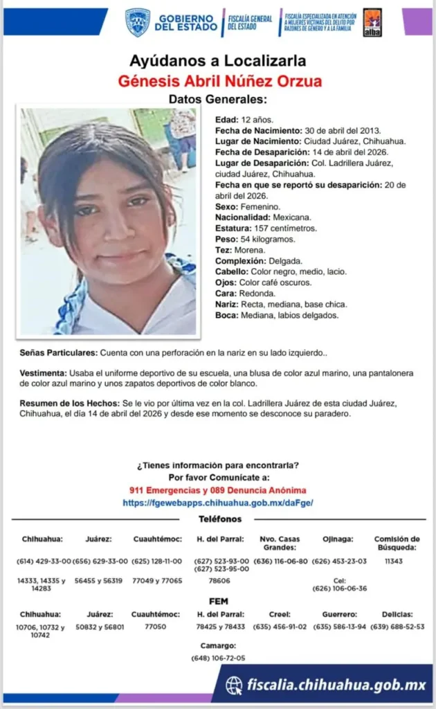 Mientras que Génesis fue vista por última vez el pasado martes 14 de abril en la colonia Ladrillera Juárez, mide 1.57 metros, es de complexión delgada, tez morena y cabello negro lacio, y cuenta con una perforación en la nariz del lado izquierdo.