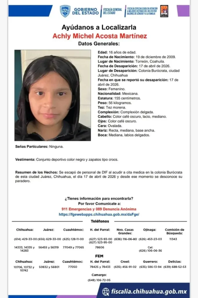 Estos dos últimos casos se suman a otros reportes realizados durante las últimas semanas, ya que Achly Michel Acosta Martínez, de 16 años, desapareció el 17 de abril en la colonia Burócrata, luego de acudir a una cita médica.